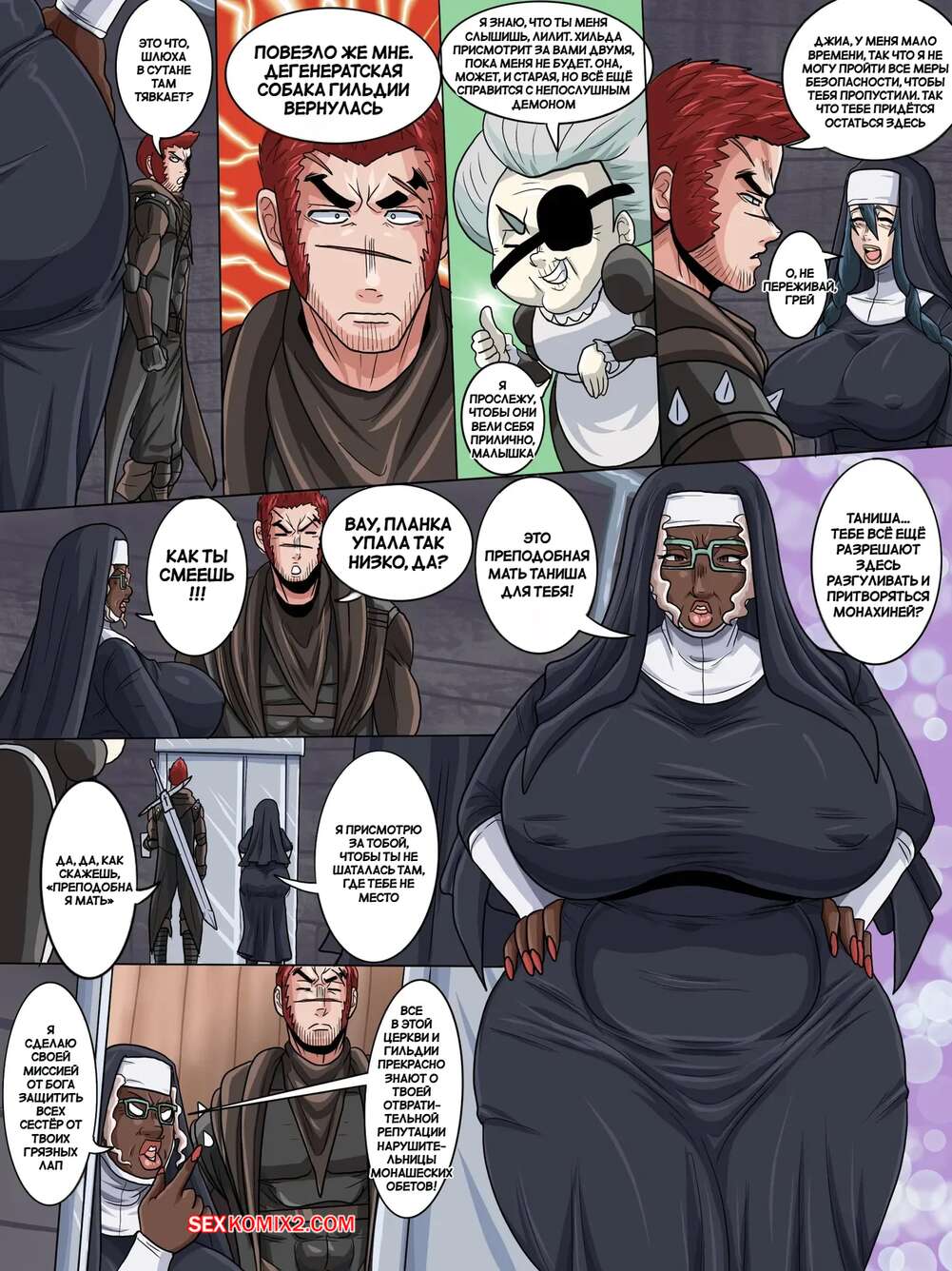 Порно комикс Секрет преподобной матери. Reverend Mothers Secret. Shatteredninja. Парень положил глаз на сексуальную темнокожую монашку. Он подкрадывается к ней сзади и лапает ее большие сиськи, после чего вставляет в нее член и жестко трахает в разных позах, делая из нее свою секс рабыню.