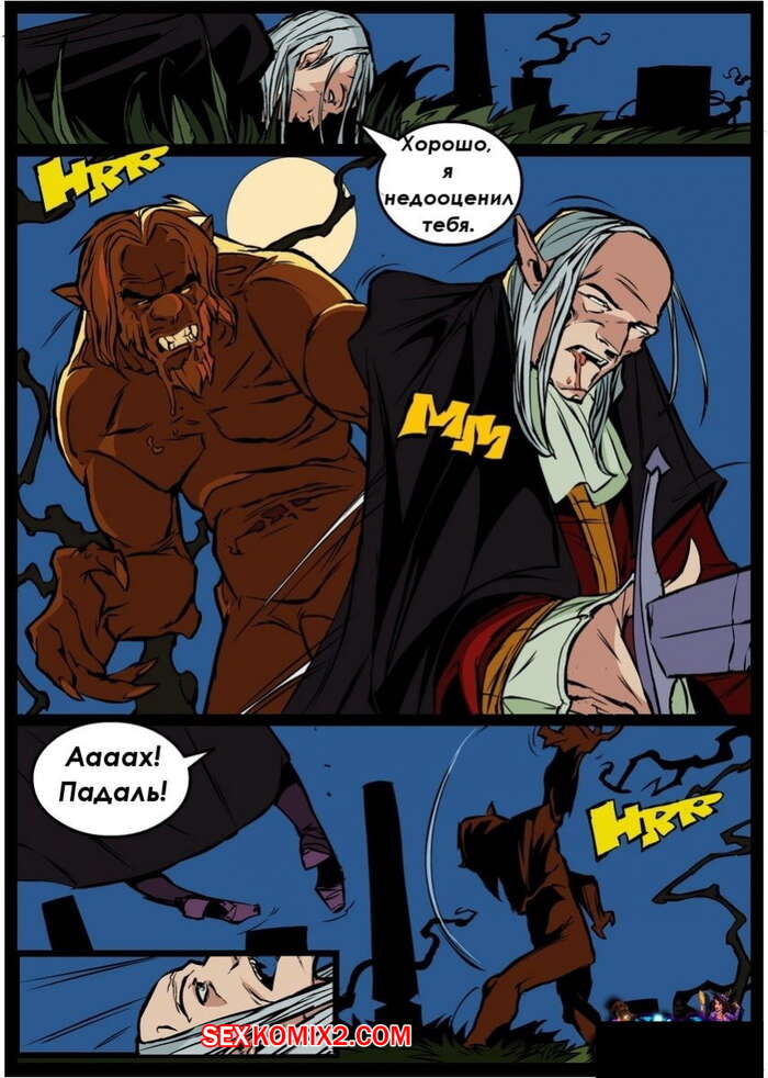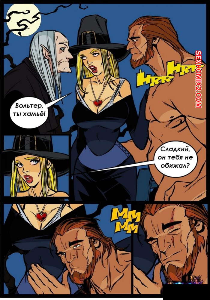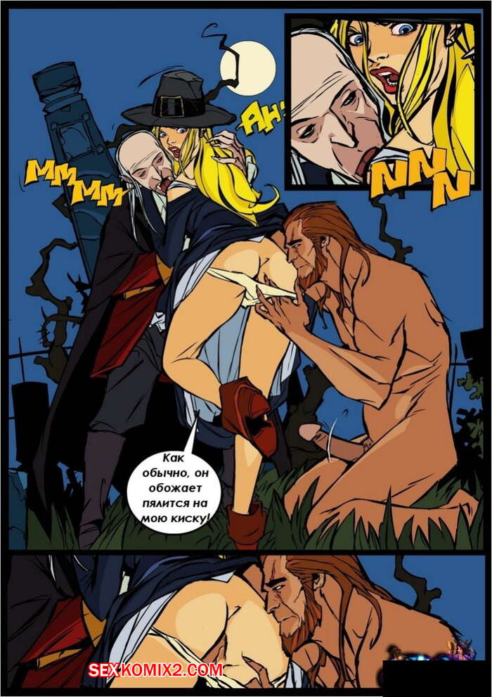 Порно комикс Ведьма. Witch. Часть 5 Красивая ведьма блондинка прервала бой между оборотнем и старым охотником на монстров. Тогда они перевели все внимание на красотку, стали ласкать ее сиськи и киску, а затем достали свои хуи, чтобы выебать ее в рот и пизду.