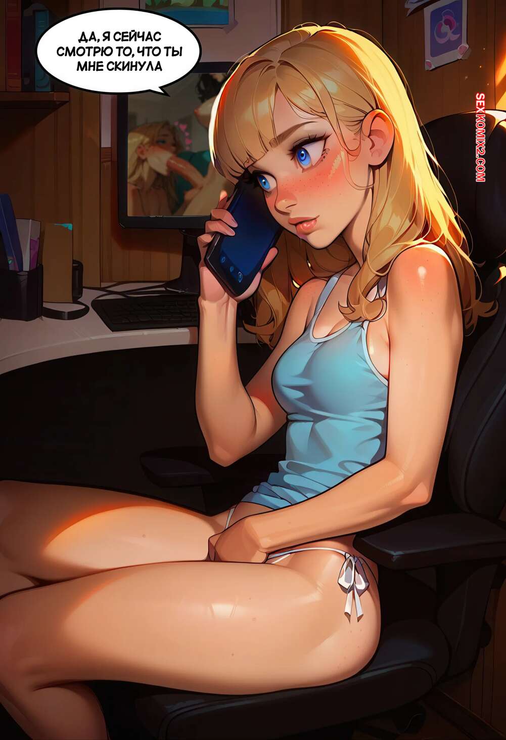 Порно комикс Моя сводная мама фута. Часть 1. My Step Futa. Stadadla. Блондиночка говорила по телефону и решила поиграться со своей пизденкой, после чего трахнула себя с помощью дилдо. Ее мачеха фута услышала стоны падчерицы и наведалась к ней со стояком.