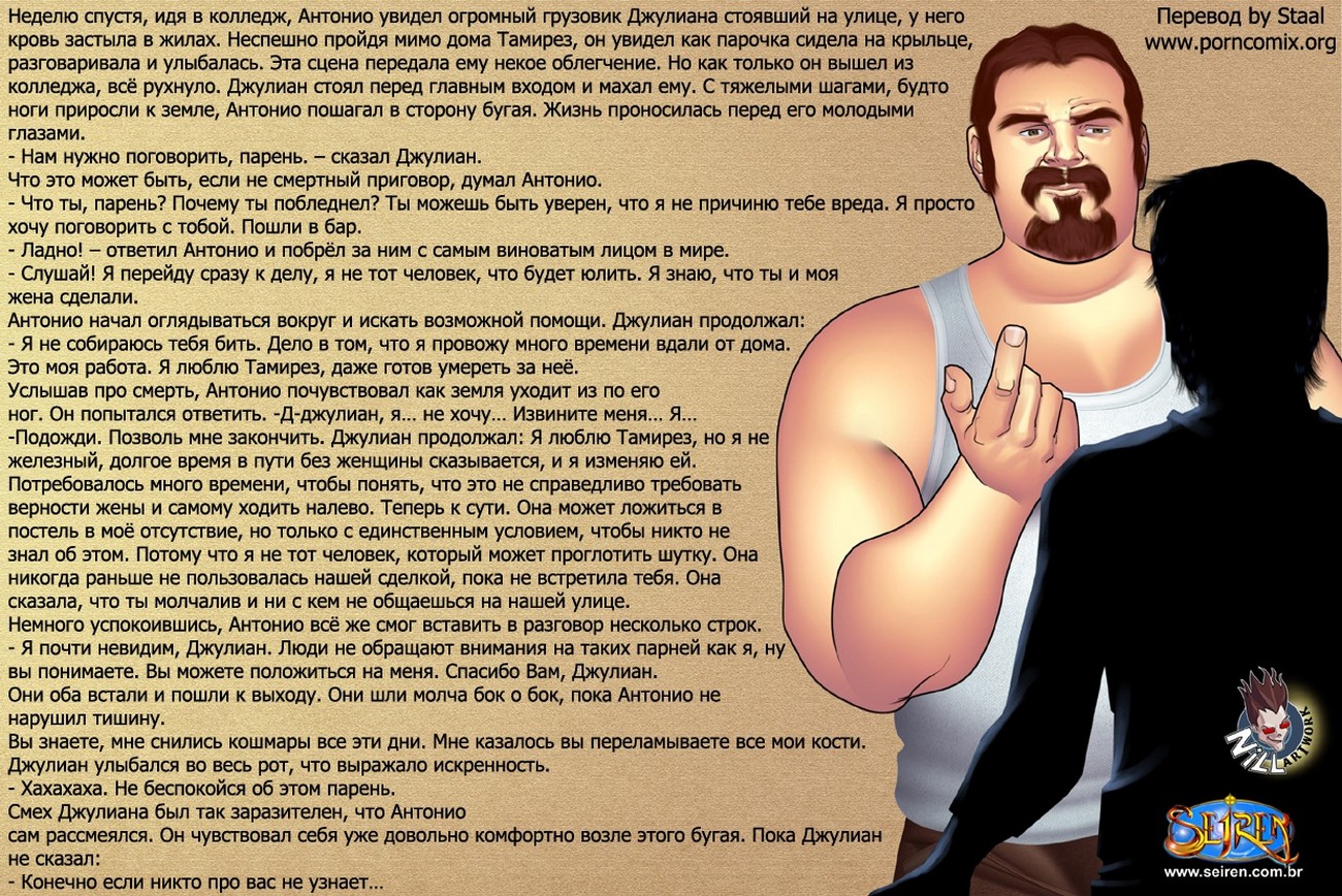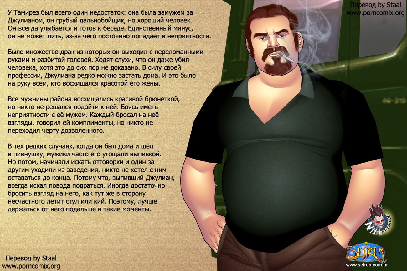 Комиксы люди секс «Женщина дальнобойщика». Муж купил своей жене о телевизор, но не смог его сам настроить. Дал ей номер настройщика, а сам ушел на работу. Это была ошибка с его стороны, потому что женщина оголодавшая сексом уже давно искала возможность уединиться с другим мужчиной, чтобы восполнить недостаток внимания. Женщина позвонила настройщика и пришел молодой парень, он делал вид что ему неинтересно горячее тело дамы. Но выдавал увеличившийся бугорок в его штанах, она это заметила. И попыталась соблазнить парня, он свою очередь не смог отказать так как женщина была очень сексуальна.