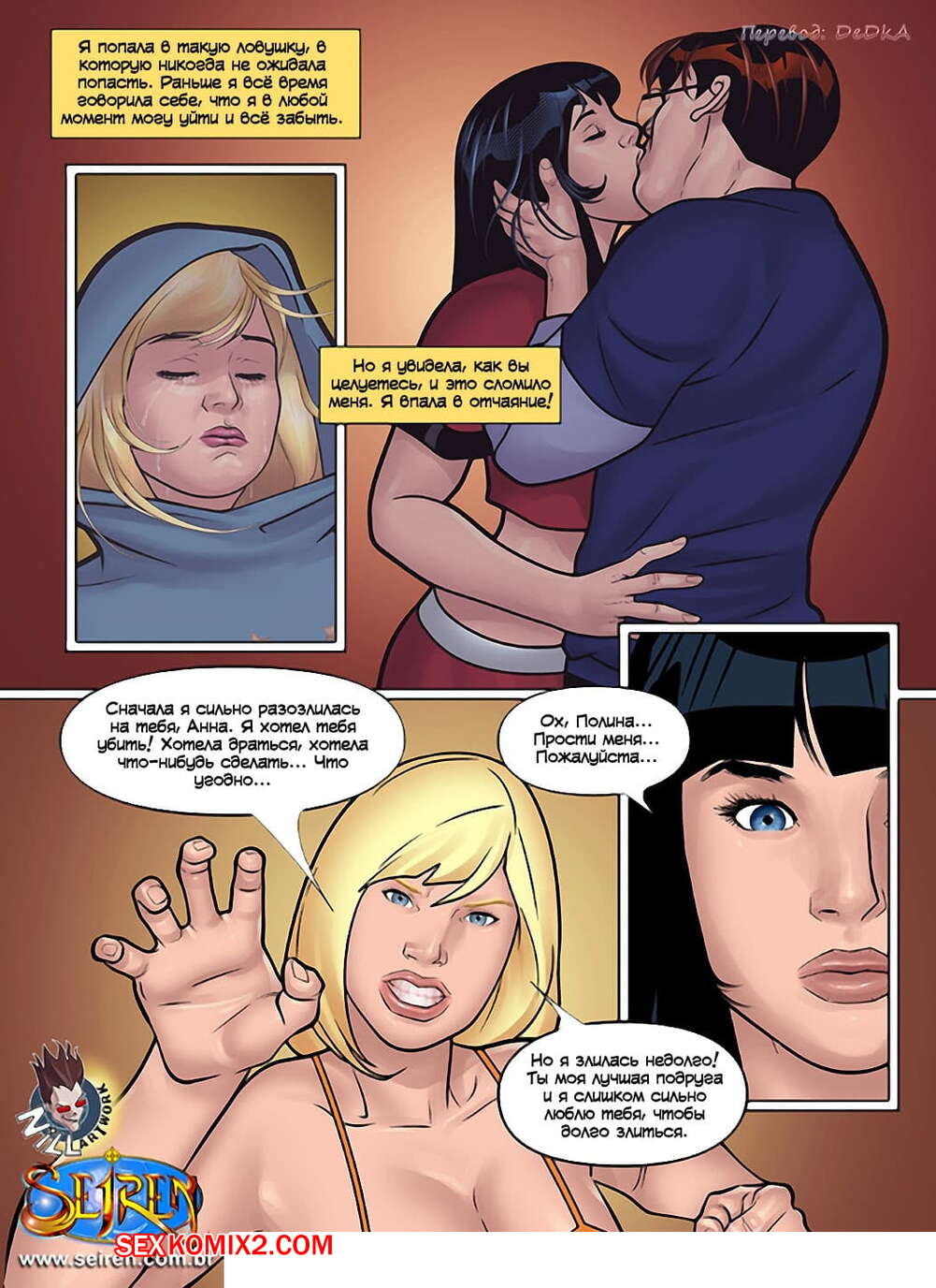 Порно комикс Ох, семейка. Часть 12 После того как блондинка красотка застала парочку за еблей, она решила к ним присоединиться. Она быстренько разделась и принялась сосать большой хуй парня, после чего вставила его хуй себе в пизду и они устроили классную групповуху.