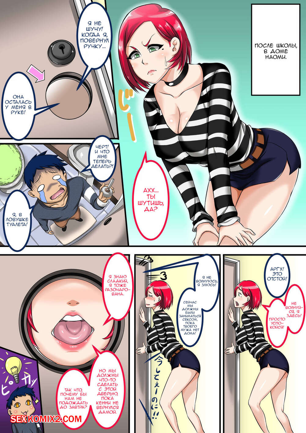 Порно комикс Дырочка в туалете. Naomi san wa Ore no Sefure Красотка вернулась со школы и пошла в туалет, но застала там своего братца, который застрял в туалете. Он просунул свой член в дырку, а сестренка стала его сосать, но затем она захотела большего и повернулась к нему пиздой, чтобы он ее хорошенько выебал.