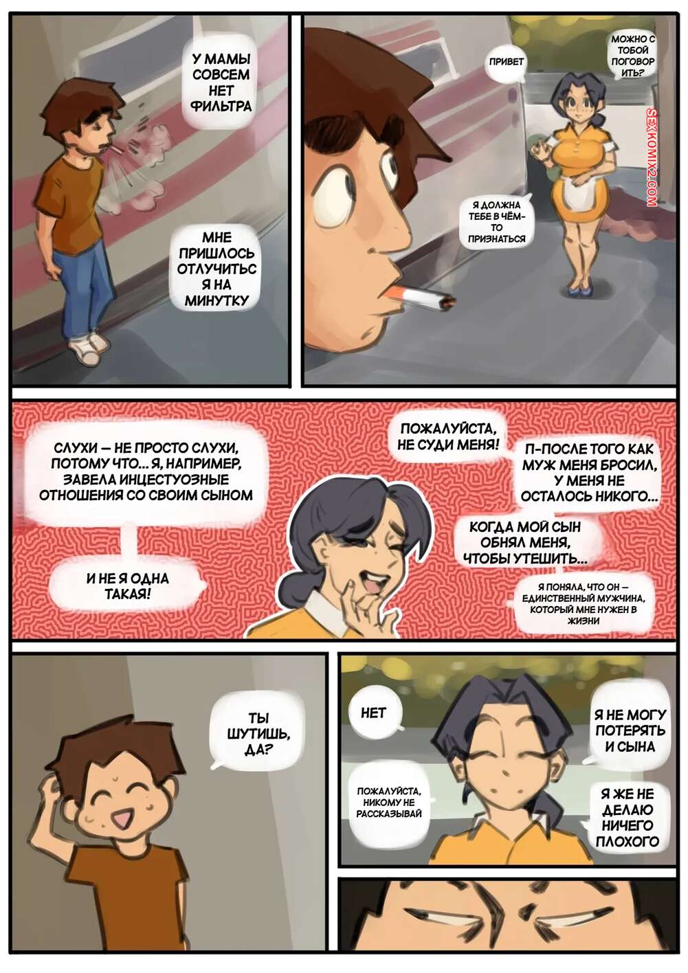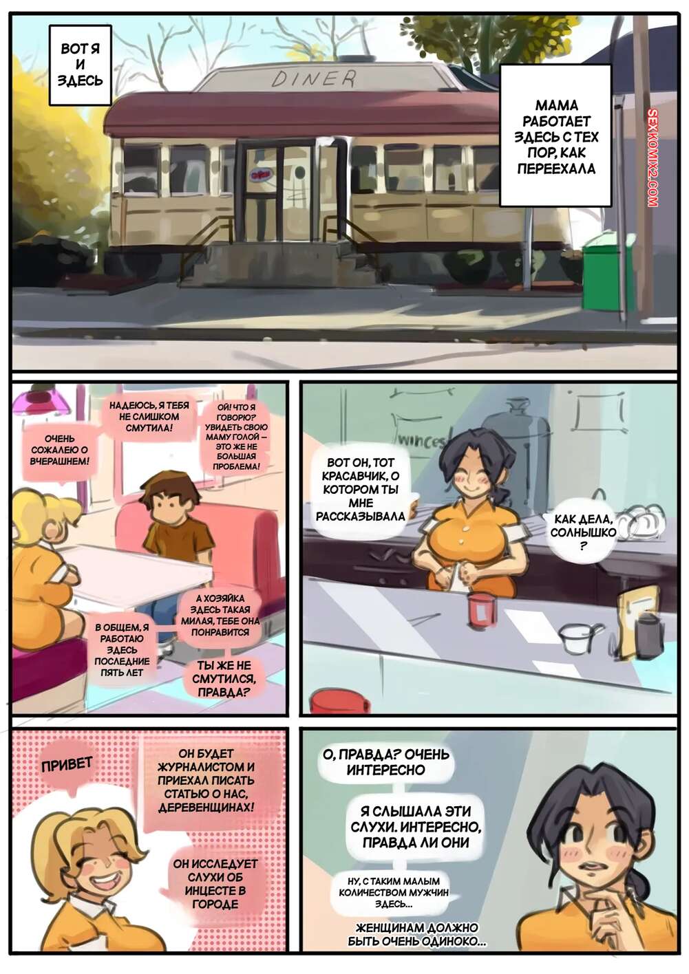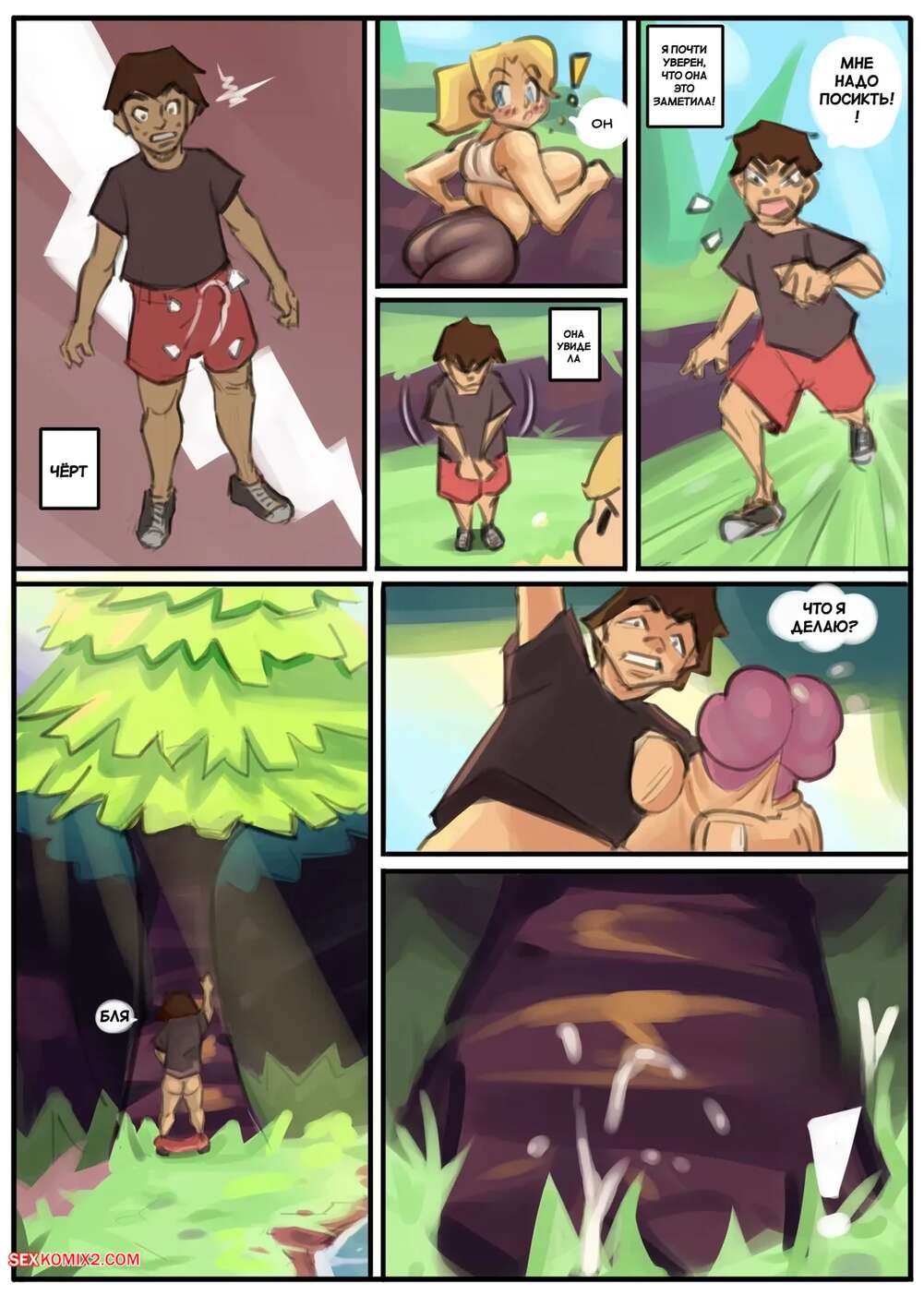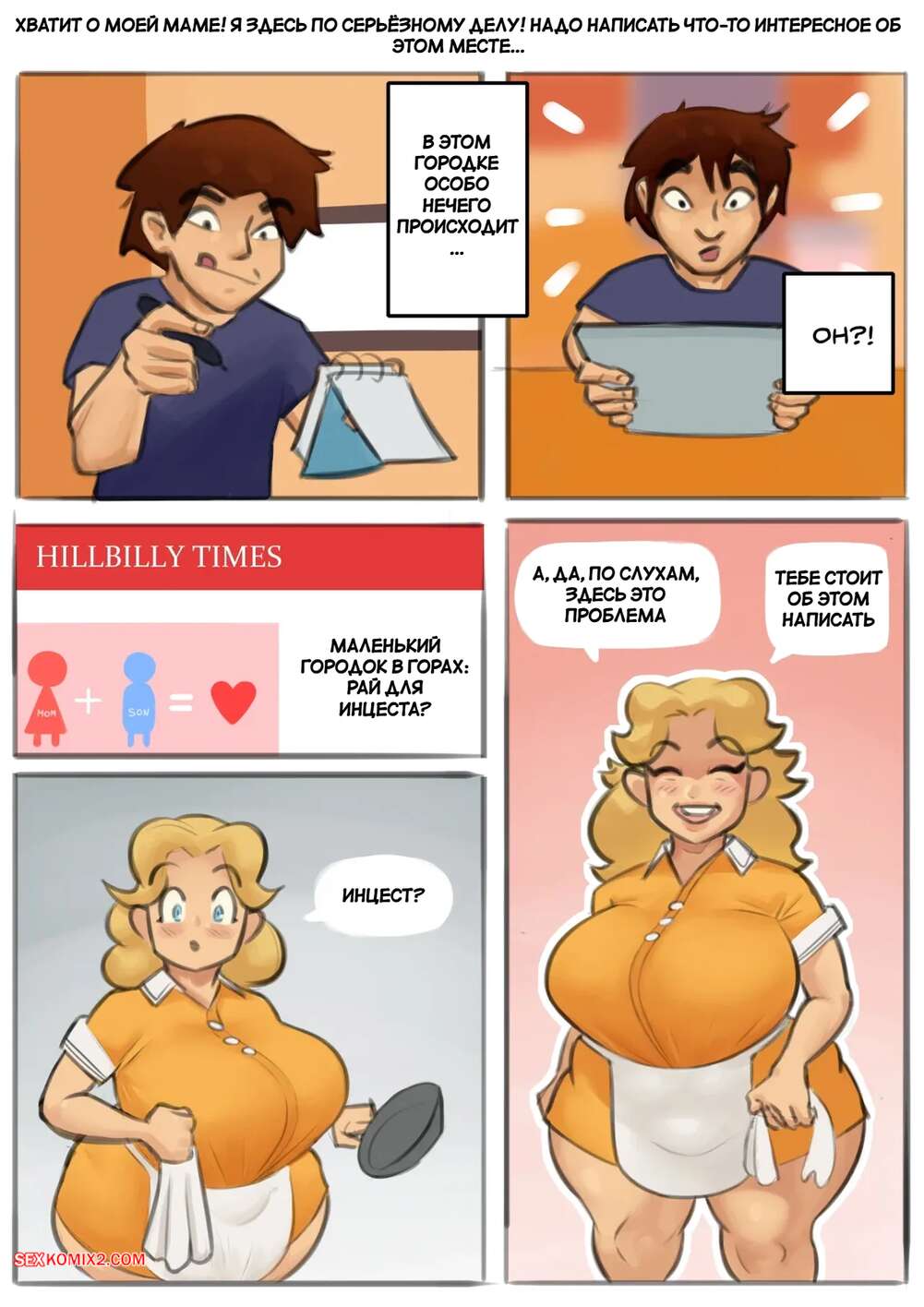Порно комикс Деревенские эдипалы. Hillbilly Oedipals. New3canvas. Горячая блондинка подглядывает за соседским парнем, пока он дрочит, и обнаруживает, что у него большое достоинство. Красотка вышла к нему голой и стала сосать его член, после чего оседлала и дала себя трахнуть.