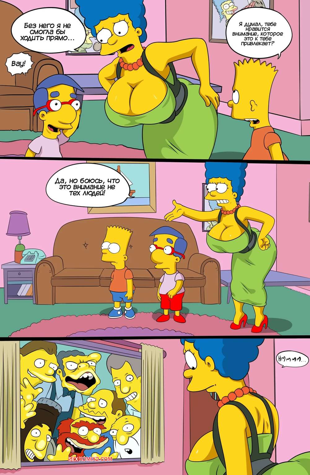 Порно комикс Симпсоны. Желтая фантазия. Часть 21. The Yellow Fantasy. Magumbos. Croc Милхауз пришел в гости к Барту и встретил его горячую мамочку. Его взгляд сразу прикован к большим сиськам аппетитной красотки, от чего он быстро возбуждается.