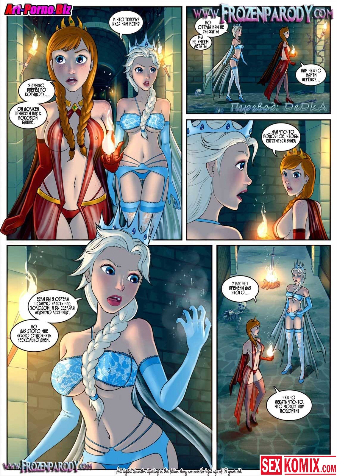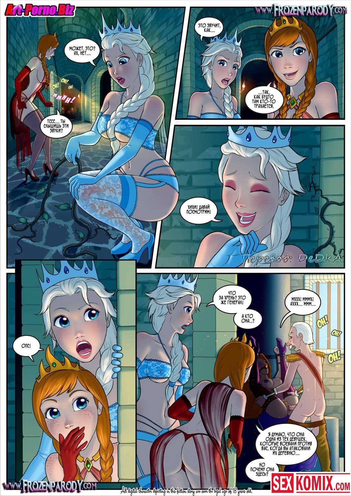 Порно комиксы принцессы. Холодное сердце. Часть 5. Три молодые девушки были в заточении у извращенца генерала, который постоянно их связывал и трахал по очереди. Однажды они проработали план побега, пока генерал был увлечен одной из девушек. Две другие выбрались из свои камеры, и попытались его оглушить. Но он их заметил, девушки выкрутились, тем что пришли специально к нему, чтобы заняться сексом. Когда генерал был в порыве оргазма, одна из девушек ударил его по голове сковородкой, и когда он отключился они сбежали.