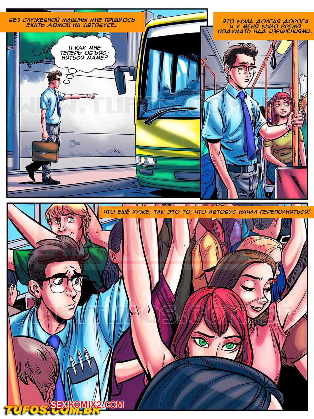 Порно комикс Лакомство заучки. Часть 8. В переполненном автобусе. O Nerd Comedor Парнишка ехал с работы в автобусе, где о его член стала тереться шикарная красотка. Потом она предложила ему вместе выйти, чтобы поебаться. Парень не мог упустить такой возможности, поэтому они отправились в переулок трахаться.