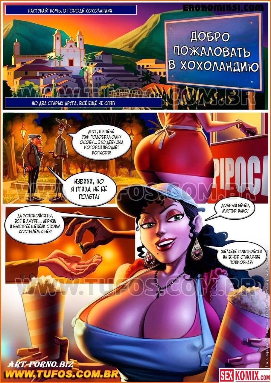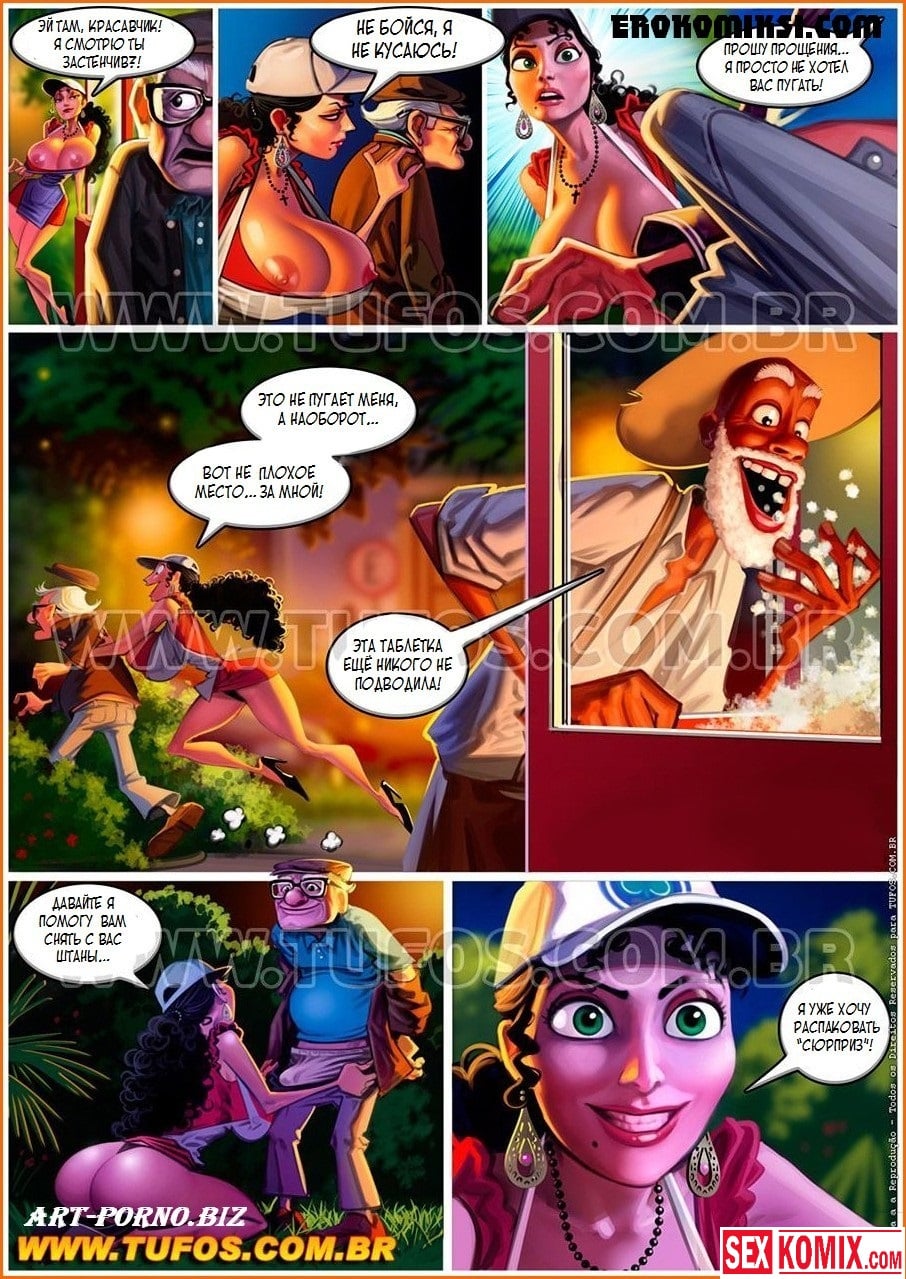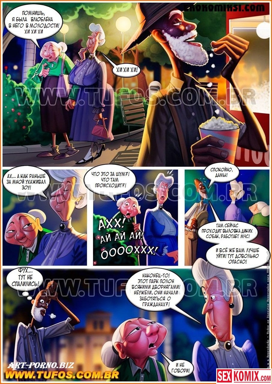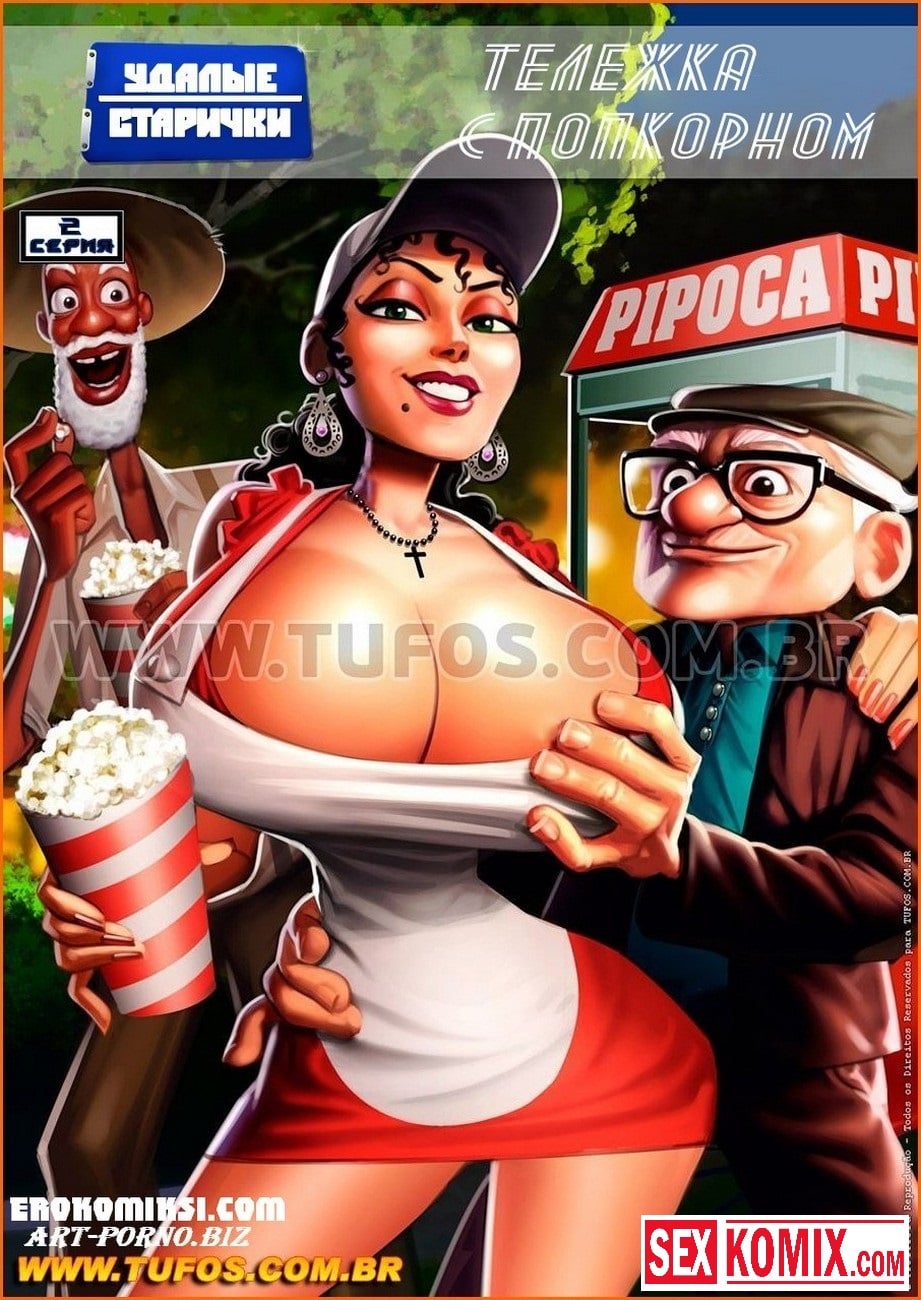 Порно комикс Удалые старички. Часть 2. Тележка с попкорном. Двое развратных стариков продолжают свои сексуальные приключения и снова отправляются в парк, чтобы снять новых красоток для секса. Им на глаза попадается красивая продавщица попкорна. По её предыстории понятно, что секс у неё не было очень давно, потому что муж не обращает на неё никакого внимания. Он только смотрит футбол по телевизору. Но эти старички знают как утешить даму, они отправляются с ней в кусты, снимаю с неё одежду и хорошенько её трахают вдвоём.