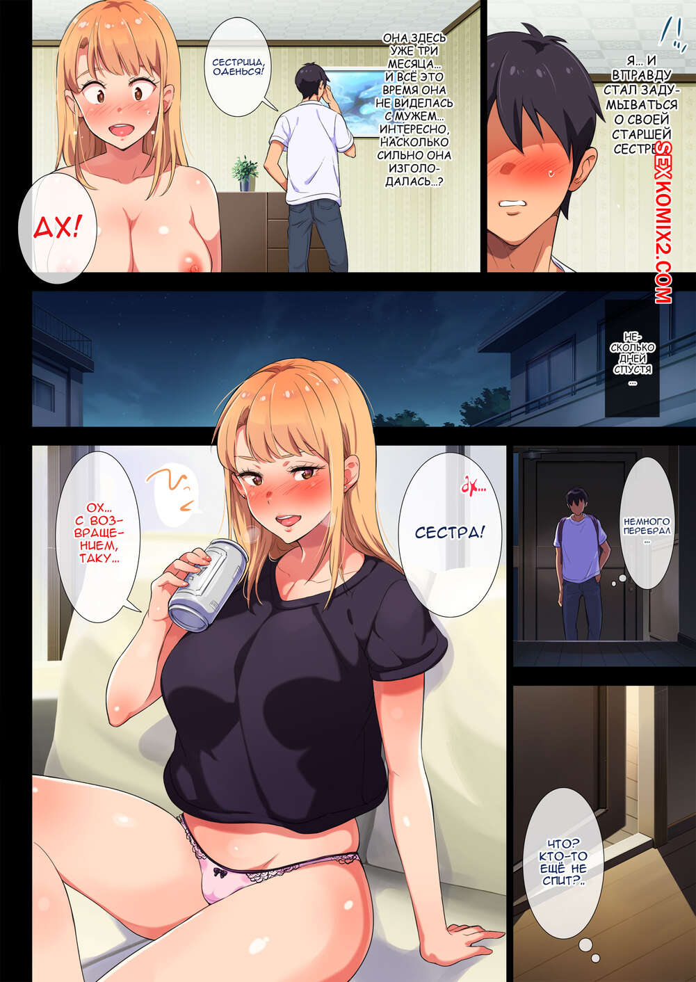 Порно комикс Моя старшая сестра кормит грудью. В доме наших родителей Парнишка засмотрелся на то, как его старшая сестра блондинка кормит грудью своего ребенка. Он очень возбудился от увиденного и захотел тоже попробовать большие сиськи своей сестры на вкус. Она с удовольствием дала ему их попробовать, а потом возбудилась и решила ему отсосать и поебаться с ним.