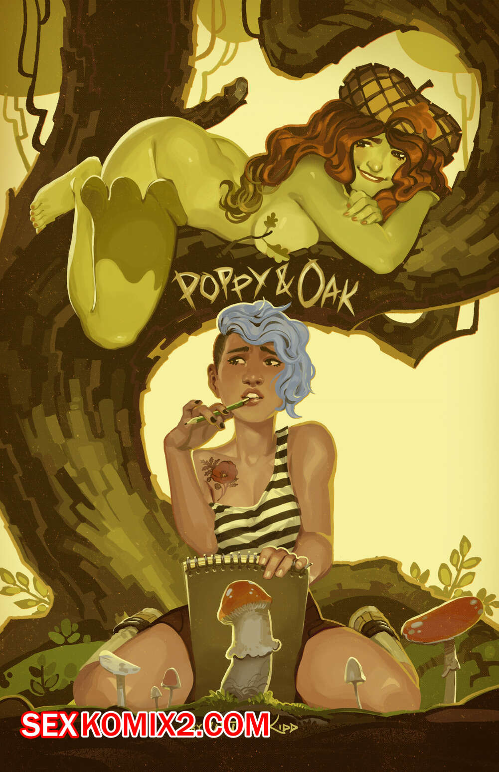 Порно комикс Поппи и Дуб Красотка с большим хуем решила прилечь отдохнуть у дуба. На нее напало сильное возбуждение и она принялась дрочить свой хуй, после чего ей компанию составила лесная красотка, которая отсосала этот большой хуй и дала себя выебать.