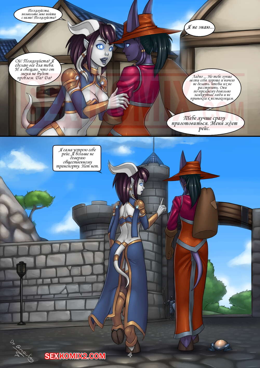 Порно комикс World of Warcraft. Эпические Путешествия и Случайные Встречи. Часть 3. Горячая красотка брюнетка продолжает свое путешествие и встречи с незнакомцами, которые привлекают ее своими огромными хуями. Сучка с радостью у них отсасывает, после чего раздвигает ножки и дает себя выебать.