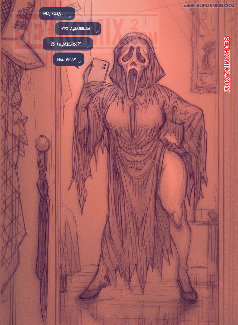 Порно комикс Хэллоуин. 2021. Новый костюм Хлои. Halloween 2021. Горячая красотка решила нарядить для хэллоуина и стала отправлять своей подруги откровенные снимки, желая узнать, как ей лучше одеться, с чулками или без. Но подруга ее игнорировала и тогда девушка решила ее наказать.