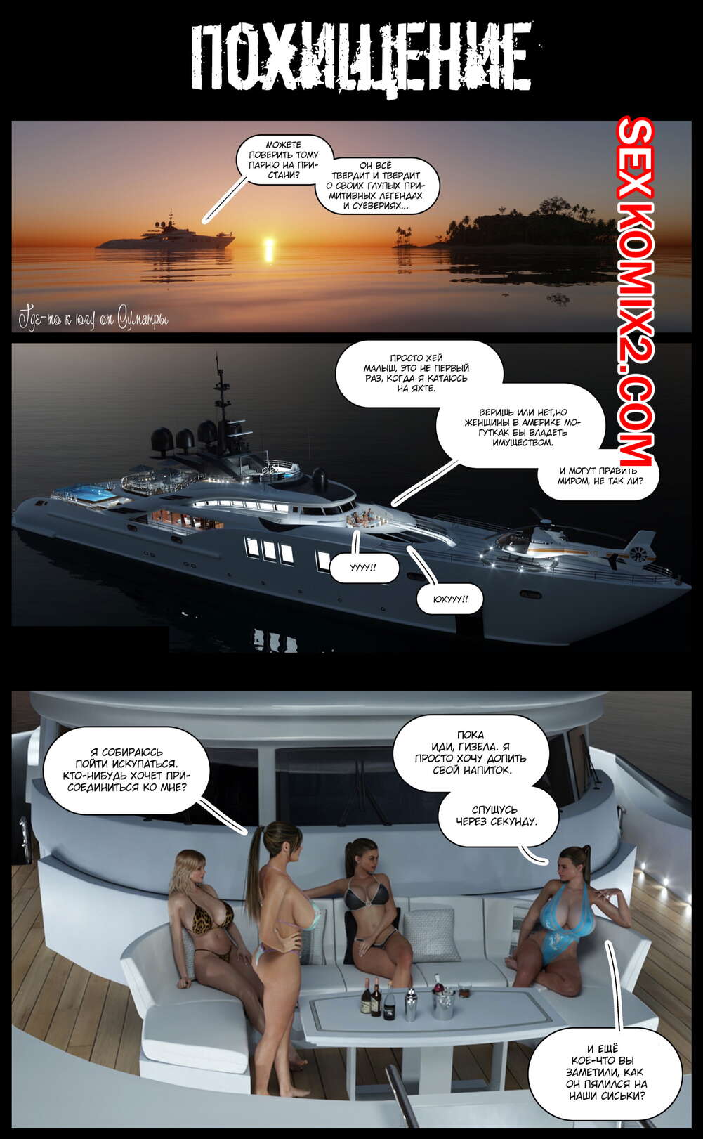 Порно комикс Похищение. The Abduction. Pegasus Горячая красотка вышла искупаться в бассейне на яхте абсолютно голой. Там на нее набросился водяной монстр и стал трахать ее в рот, после чего он ее хорошенько выебал, а затем похитил и убрался в воду.
