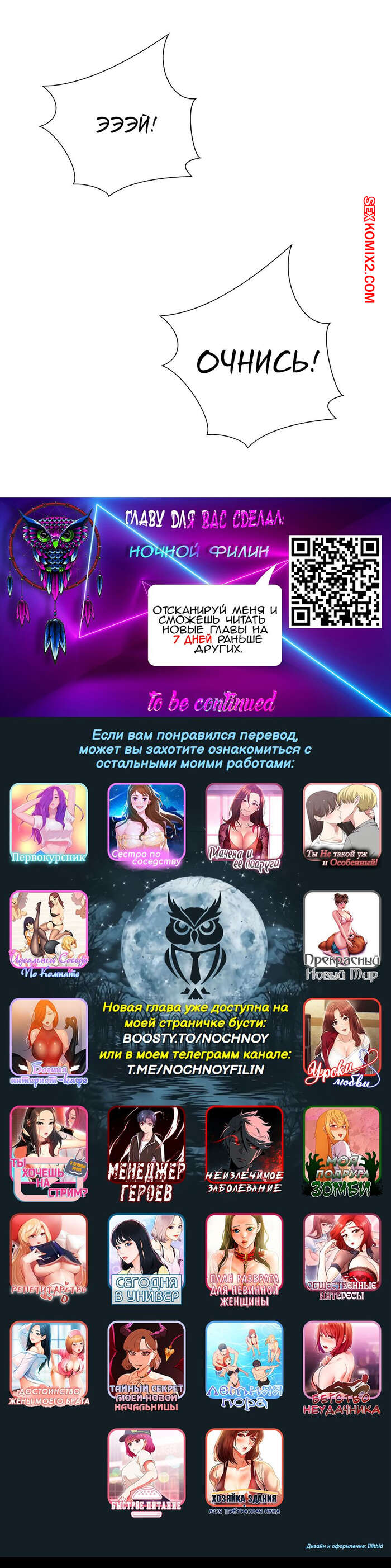 ???2021-12-08Угу, angels calling, согласен. Ну бля интерестно, как девушка которая его клеила весь комикс, может его любить. Но мне нравится что гг настолько тупой, что он этого не понимает. А кстати, я почему-то везде вижу олицетворение Тима(помню, как я чуть не похоронил "сестру по соседству"). Ну вот сейчас у гг такая же проблема как у Тима, он тоже не может определиться с кем ему встречаться.А ещё, мне одному интересно когда переведут театральный клуб? А то его то Валёк переводит, то Фокс. Вообщем то, хрен понять кого обнять.