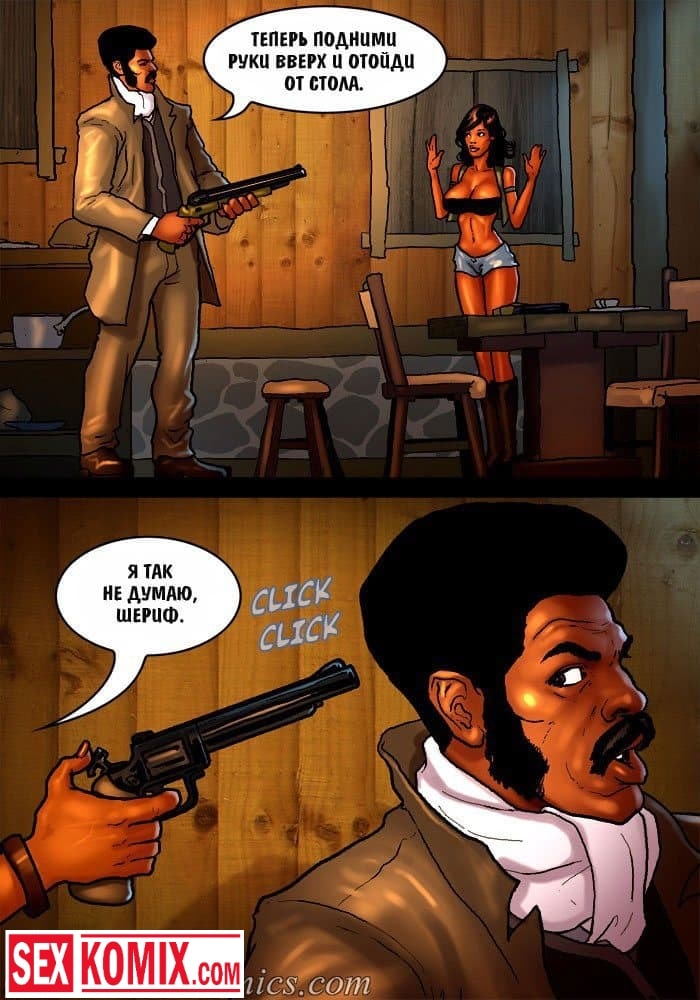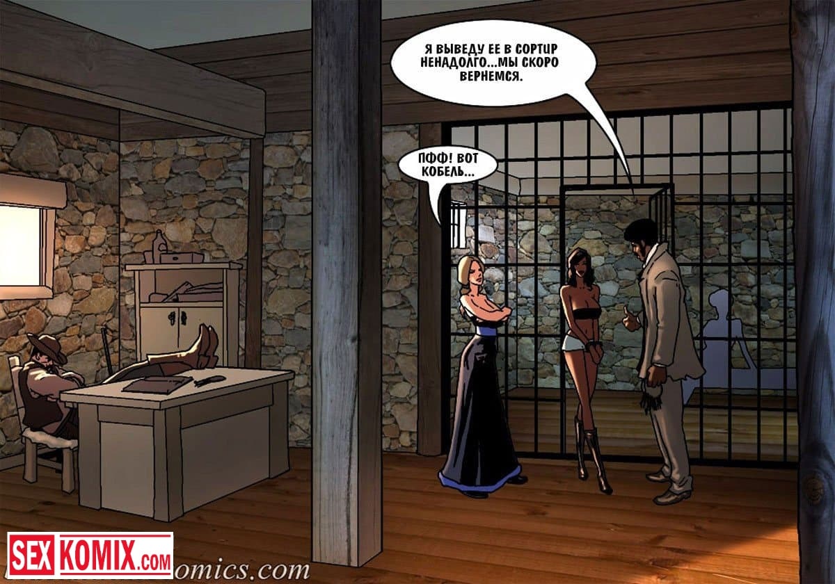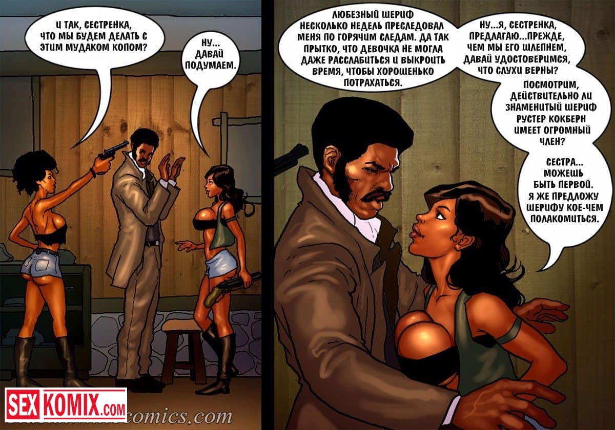 Порно комикс Честный коп. Часть 4. Ковбой с дикого запада со своей сексуальной напарницей, пришли к убежищу известной преступницы. Он оставил свою подругу на подстраховке, а сам пошел в хижину, чтобы схватить бандитку. Но когда она была у него на мушке, мужчина почувствовал ствол у своего затылка, это была вторая девушка. Они решили наказать копа, и соблазнили его своими сексуальными телами. Мужчина не смог вывернуться из ситуации, ему пришлось трахнуть их.
