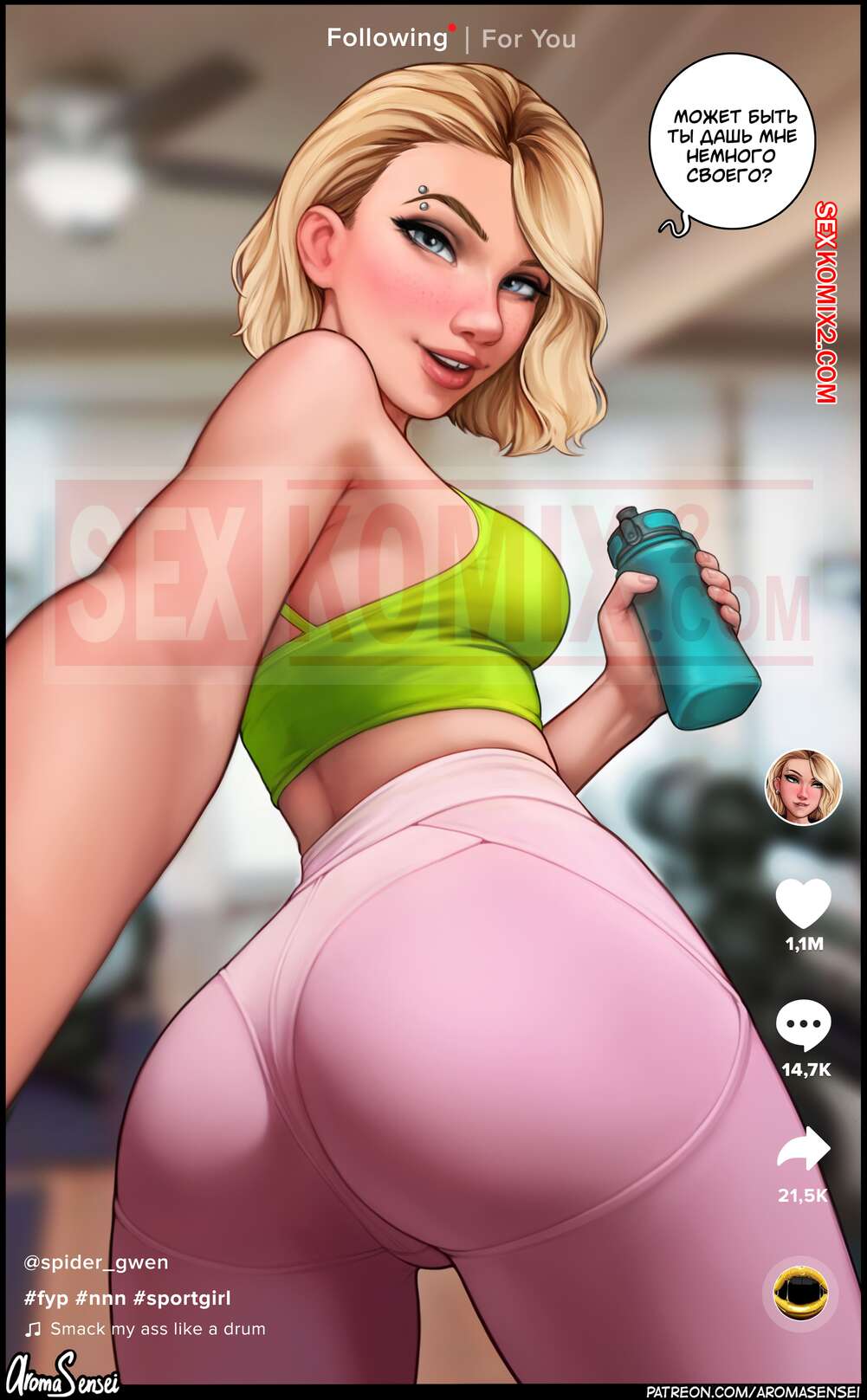 Порно комикс Spiderman. Тикток Гвен. Gwen Tiktok. AromaSensei Горячая блондинка Гвен стала снимать свое прекрасное тело в тикток, а затем встретилась с пареньком с большим черным хуем в спортзале и раздвинула перед ним свои ножки, чтобы он ее хорошенько выебал.