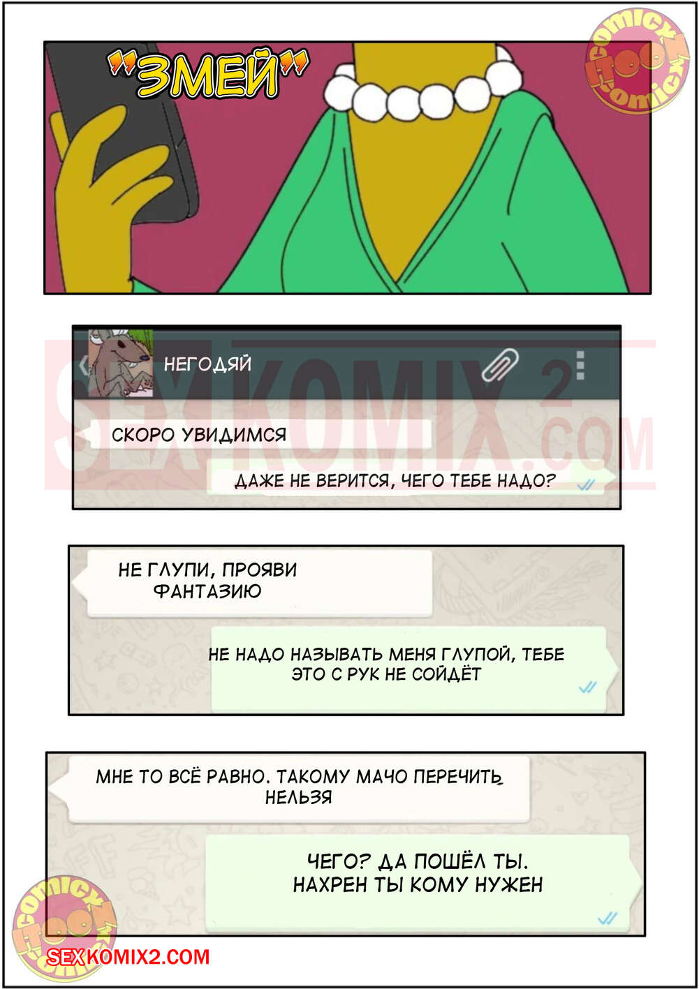 Порно комикс Симпсоны. Часть 4. Змей. Эпизод 1. Simpsons. Snake. IToonEAXXX Мужик позвонил горячей молодой красотке и предложил ей встретиться ночью в мотеле. Когда девушка приехала, мужик уже ждал ее голый и сразу дал ей отведать свой член на вкус и хорошенько выебал красотку.