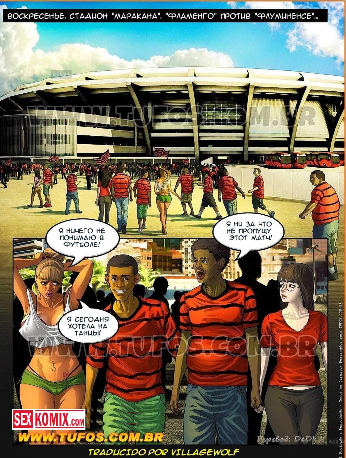Порно комикс Семейка из трущоб. Часть 5. Маракана. ФЛУ против ФЛА. Парень взял свою сексуальную девушку на футбольный матч, этого событие все ждали уже очень давно и хорошо подготовились, фанаты отделить тематические футболки. Но девушка одела вызывающий топ с большим вырезом, ее огромные сиськи торчали наружу. Когда она пришла на стадион все парни вместо того, чтобы смотреть матч обращали внимание на ее большую грудь. Ее бойфренд предложил ей одеть его майку, но девушка отказалась. Вместо этого она увела его в подсобное помещение, и они занялись сексом.