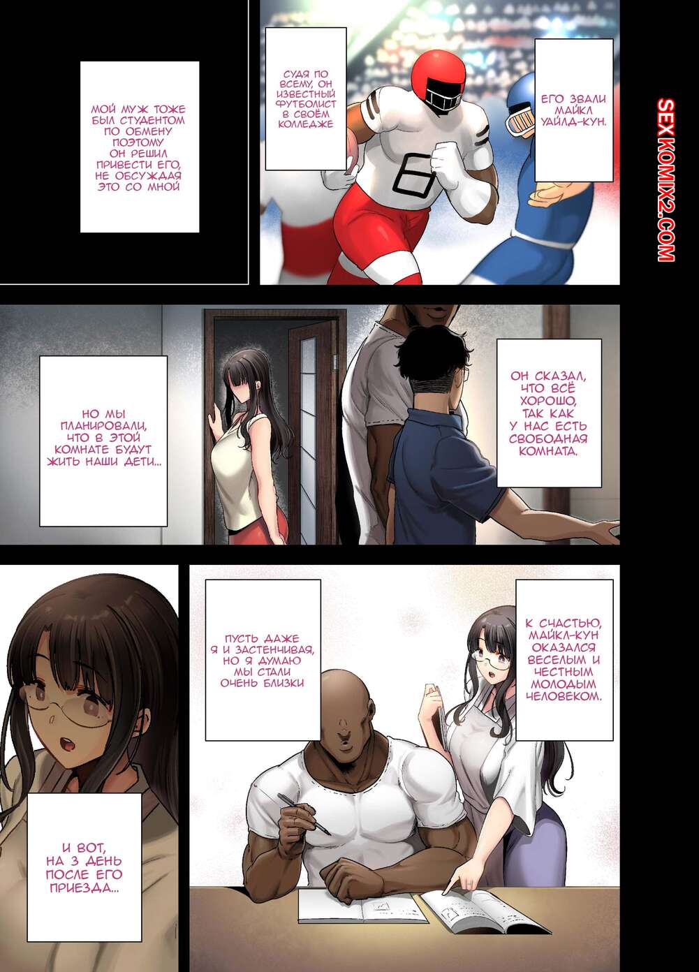 Порно комикс Как увести японскую домохозяйку. В цвете Черный парнишка с большим хуем засматривался на горячую милфу с большими сиськами у нее дома. Он решил подкатить к ней и стал ласкать ее большие сиськи, после чего они отправились в комнату, где сучка отсосала большой хуй парня и дала ему себя выебать.