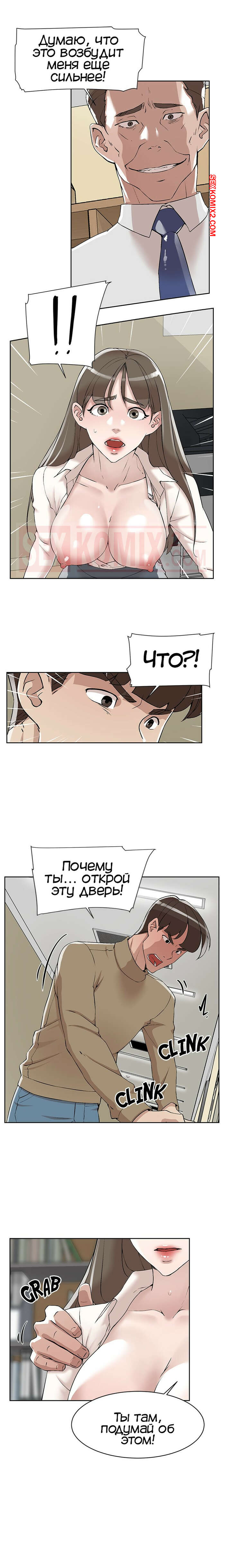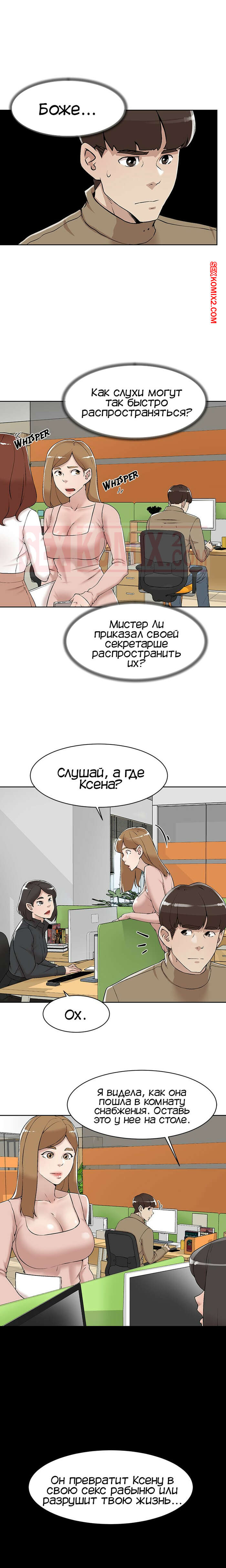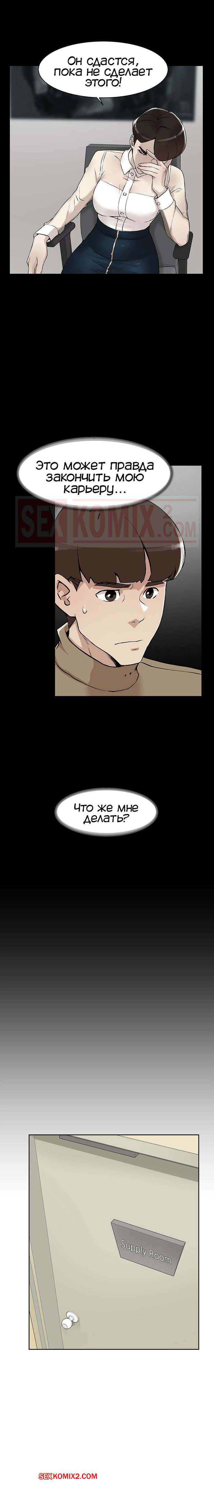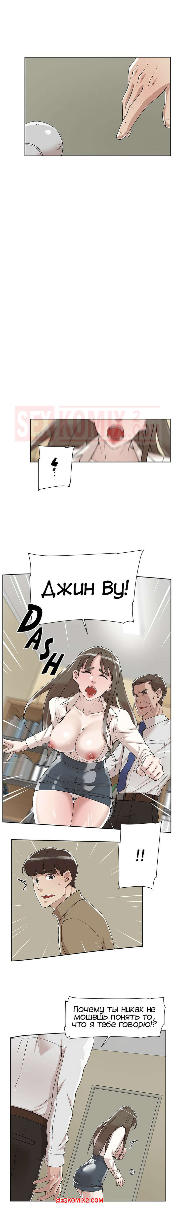 Порно комикс Её 4 размер. Часть 121. Her 4 Incher Парнишка пошел искать свою подругу, которая была закрыта в рабочей комнате с боссом. Он продолжал до нее домогаться и звать с ним ебаться, угрожая главному герою.