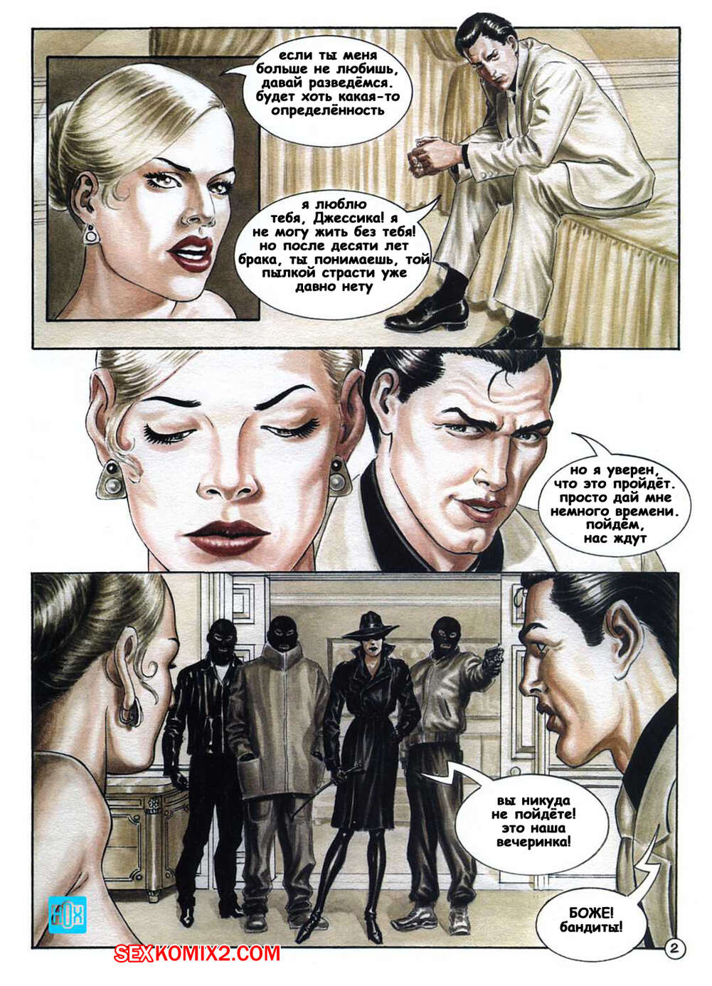 Порно комикс Изнасилование жены бандой налетчиков на глазах мужа На мужика и его жену напали бандиты и решили повеселиться с милфой брюнеткой. Они раздели ее и дали ей отсосать свои большие хуи, после чего хорошенько ее выебали, получив удовольствие.