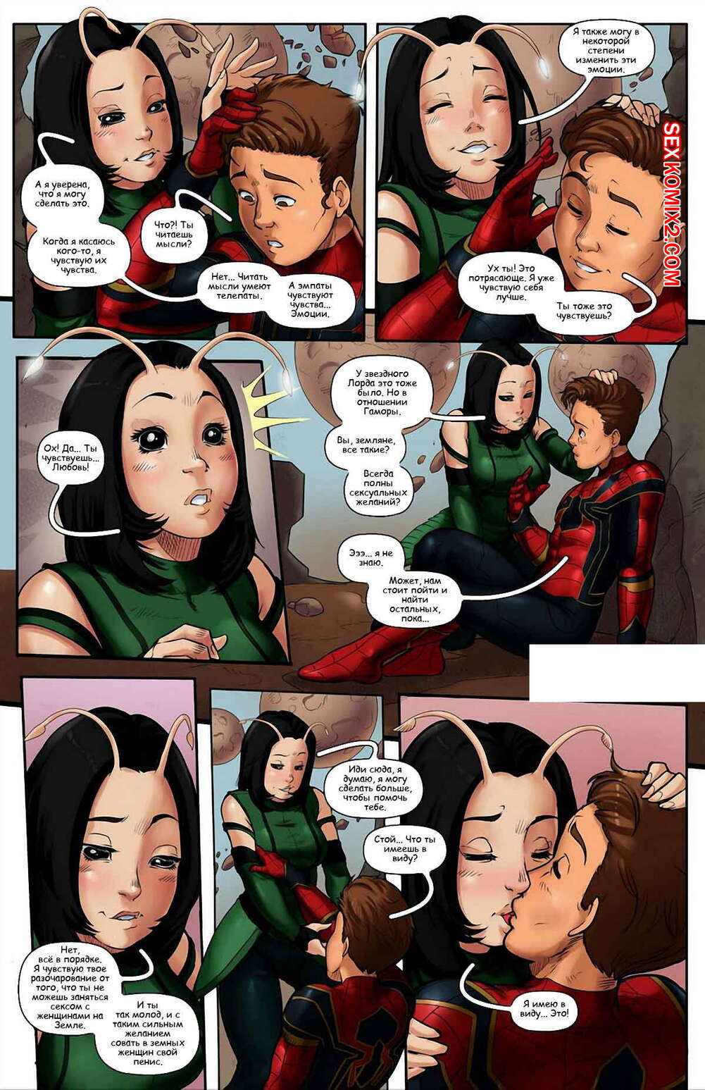 Порно комикс Человекпаук. Война Бесконечности. Tracy Scops Питеру Паркеру стало страшно перед битвой с Таносом, поэтому Мантис решила помочь ему расслабиться. Сучка достала его большой хуй и стала у него отсасывать, после чего дала ему себя хорошенько выебать в пизду и задницу.