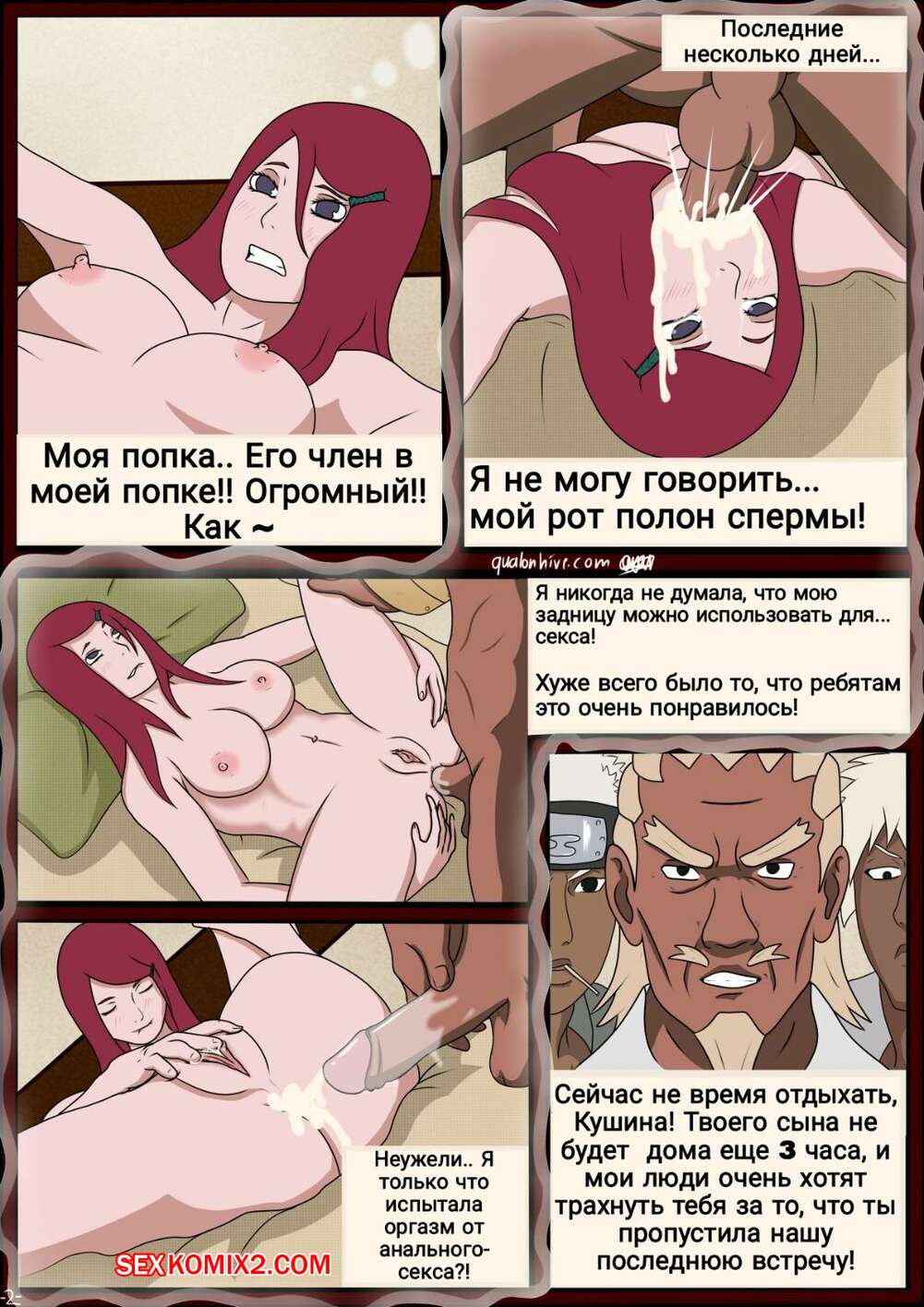 Порно комикс Наруто. Гендзюцу Сисястая милфа Кушина отправила Наруто из дома, чтобы встретиться со своим темнокожим любовником. Она разделась перед ним и стала сосать его большой хуй, после чего дала ему выебать себя в задницу.