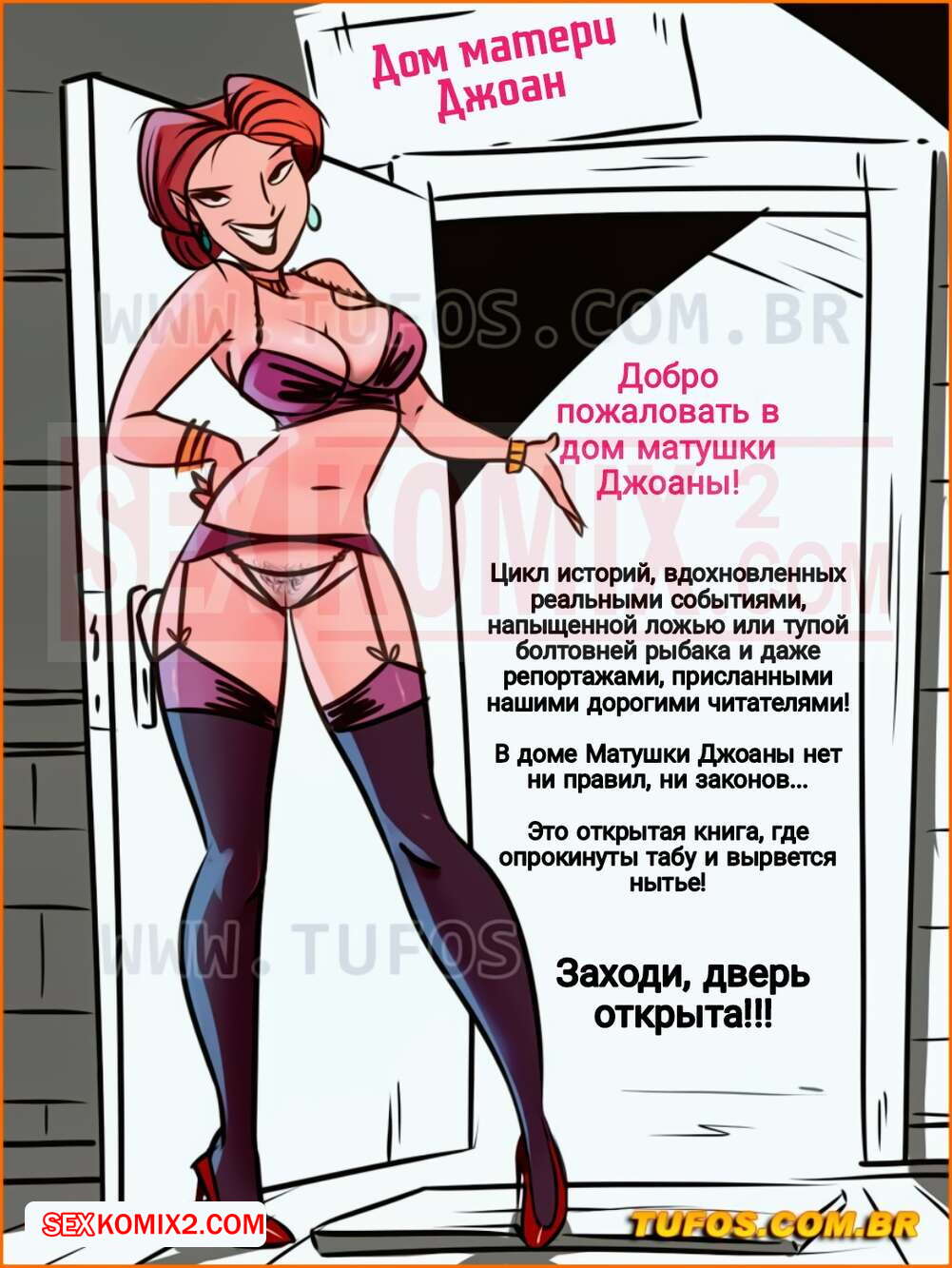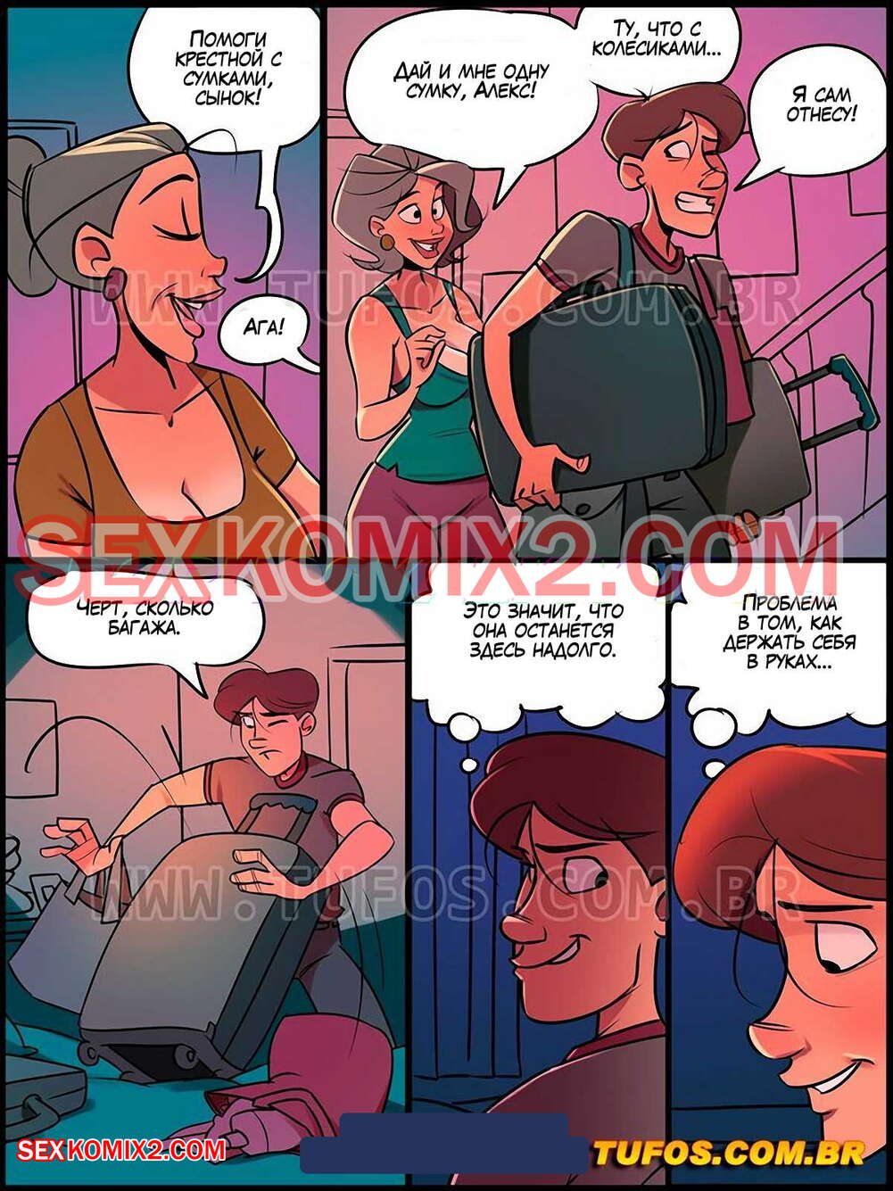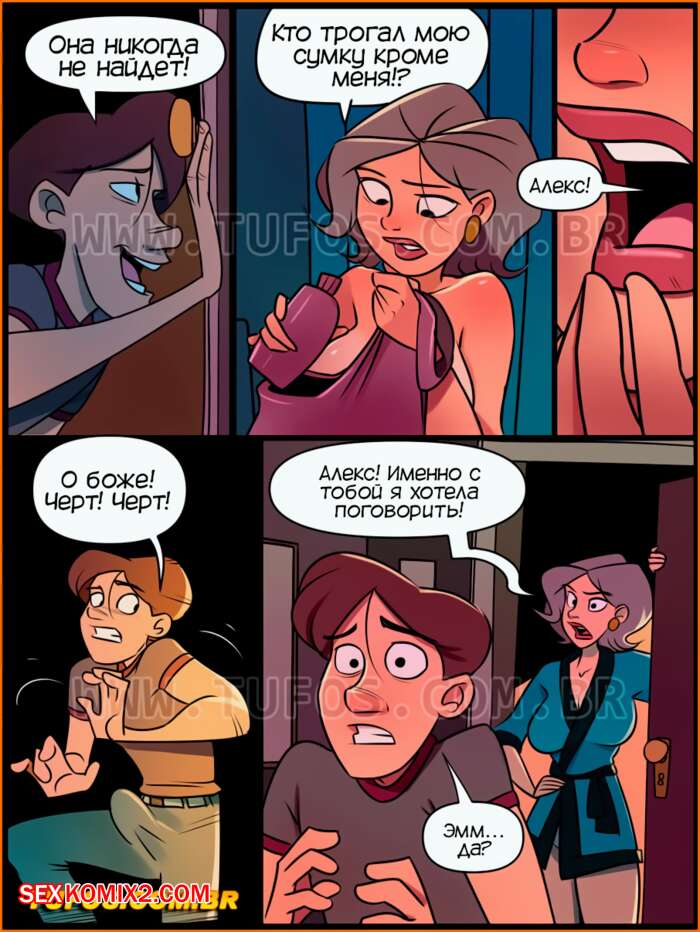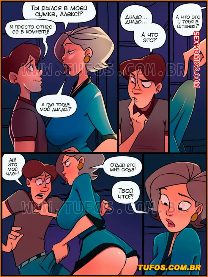 Порно комикс Дом мамы Джоаны. Часть 16. Дилдо Джулианы. Tufos К парню и его мамке домой приехала его крестная. Он помогал ей отнести чемоданы и нашел у нее в сумке большой розовый дилдо. Парень чертовски возбудился и решил подглядеть как милфа переодевается.